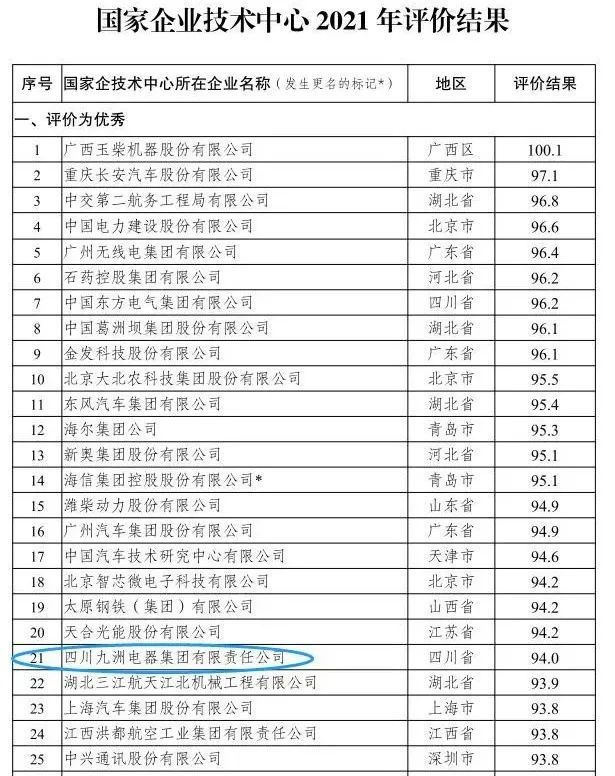 Jiuzhou’s National Enterprise Technology Center has passed the annual evaluation of 2021, with a best ever score,and successfully shortlisted in level of excellence. With a 94 points, we have ranked the 21st place in 1744 national enterprise technology centers in whole country,and the 2nd place in 89 centers in Sichuan province.