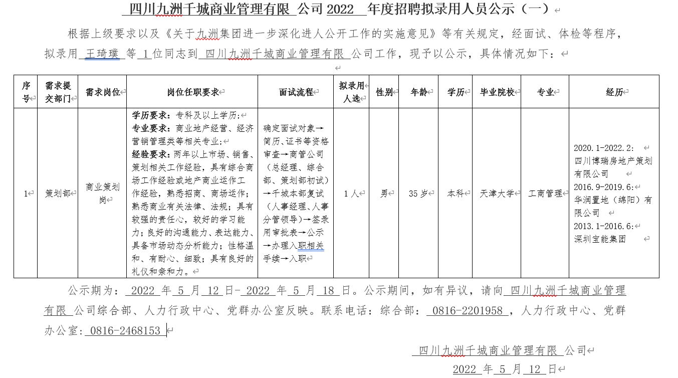 bat365在线平台九洲千城商业管理有限公司2022年度招聘拟录用人员公示(一)