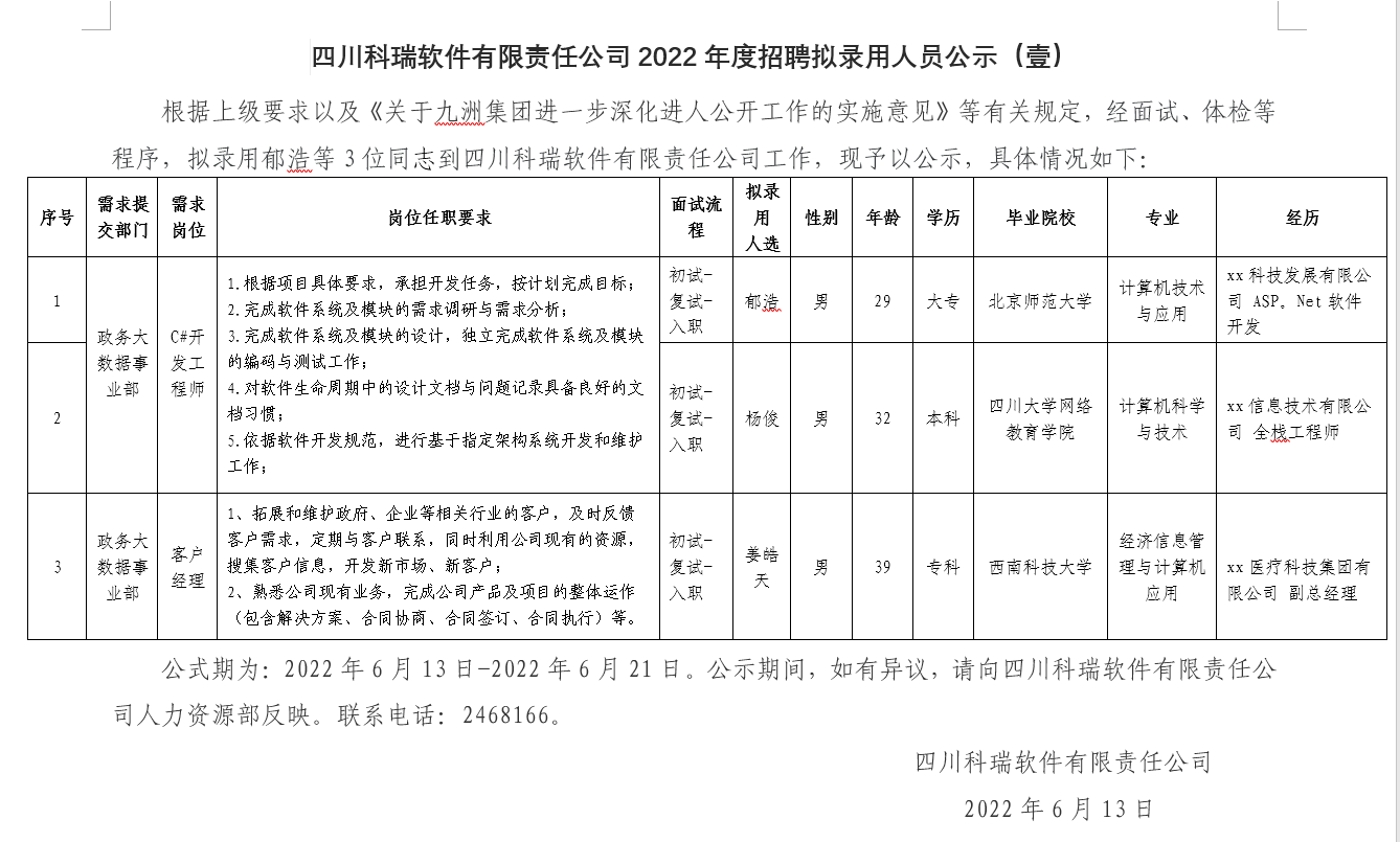 四川科瑞软件有限责任公司2022年度招聘拟录用人员公示(壹)