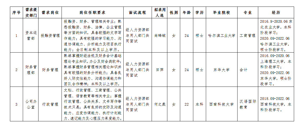根据上级要求以及《关于九洲集团进一步深化进人公开工作的实施意见》等有关规定,经面试、体检等程序,拟录用尚晞铖等三位同志到bat365在线平台九洲投资控股集团有限公司工作,现予以公示,具体情况如下: