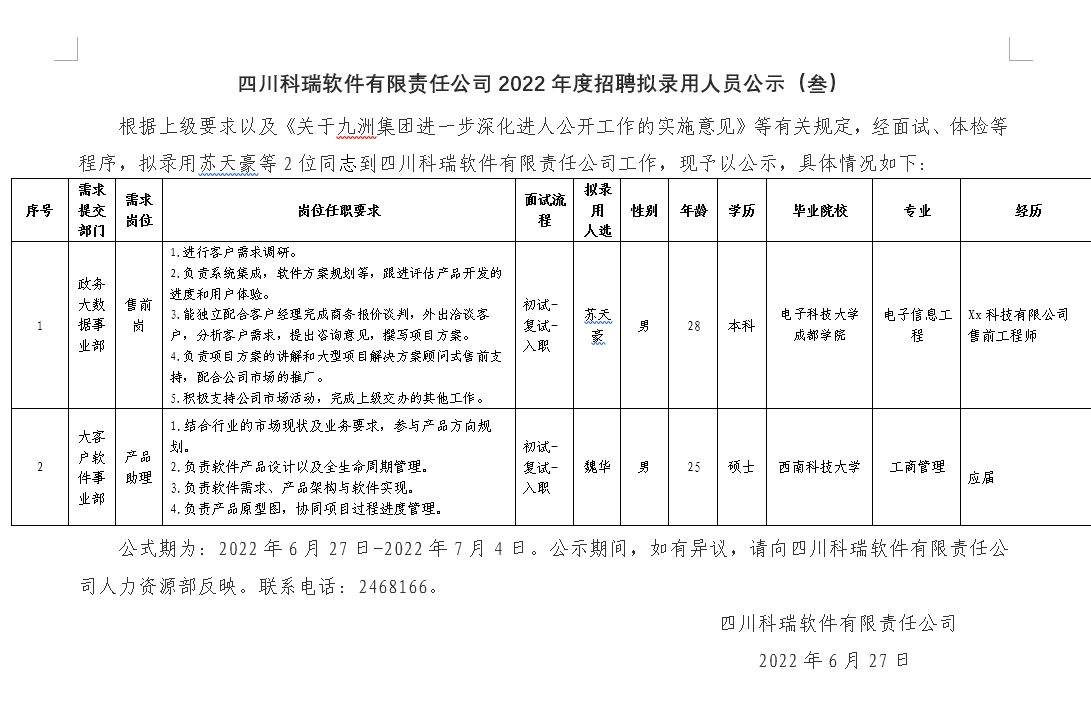 四川科瑞软件有限责任公司2022年度招聘拟录用人员公示(叁)