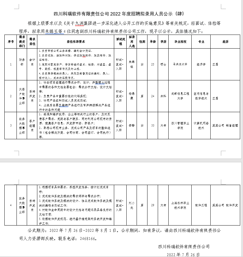 四川科瑞软件有限责任公司2022年度招聘拟录用人员公示(肆)
