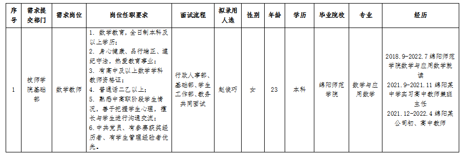 根据上级要求以及《关于九洲集团进一步深化进人公开工作的实施意见》等有关规定,经面试、体检等程序,拟录用赵俊巧同志到bat365在线平台九洲教育投资管理有限公司工作,现予以公示,具体情况如下: